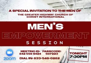 A Special Invitation to the Men of the Greater Highway Church of Christ International Join Us for the Matters for Men Empowerment Session Thursday, April 22, 2021 7:30 p.m. This will be a Zoom event! To Join Zoom Meeting: Dial Toll-Free 833 548 0282 US Toll-free 877 853 5257 US Toll-free 888 475 4499 US Toll-free Meeting ID: 842 556 9424 Passcode: 507223 Or Click the link below!